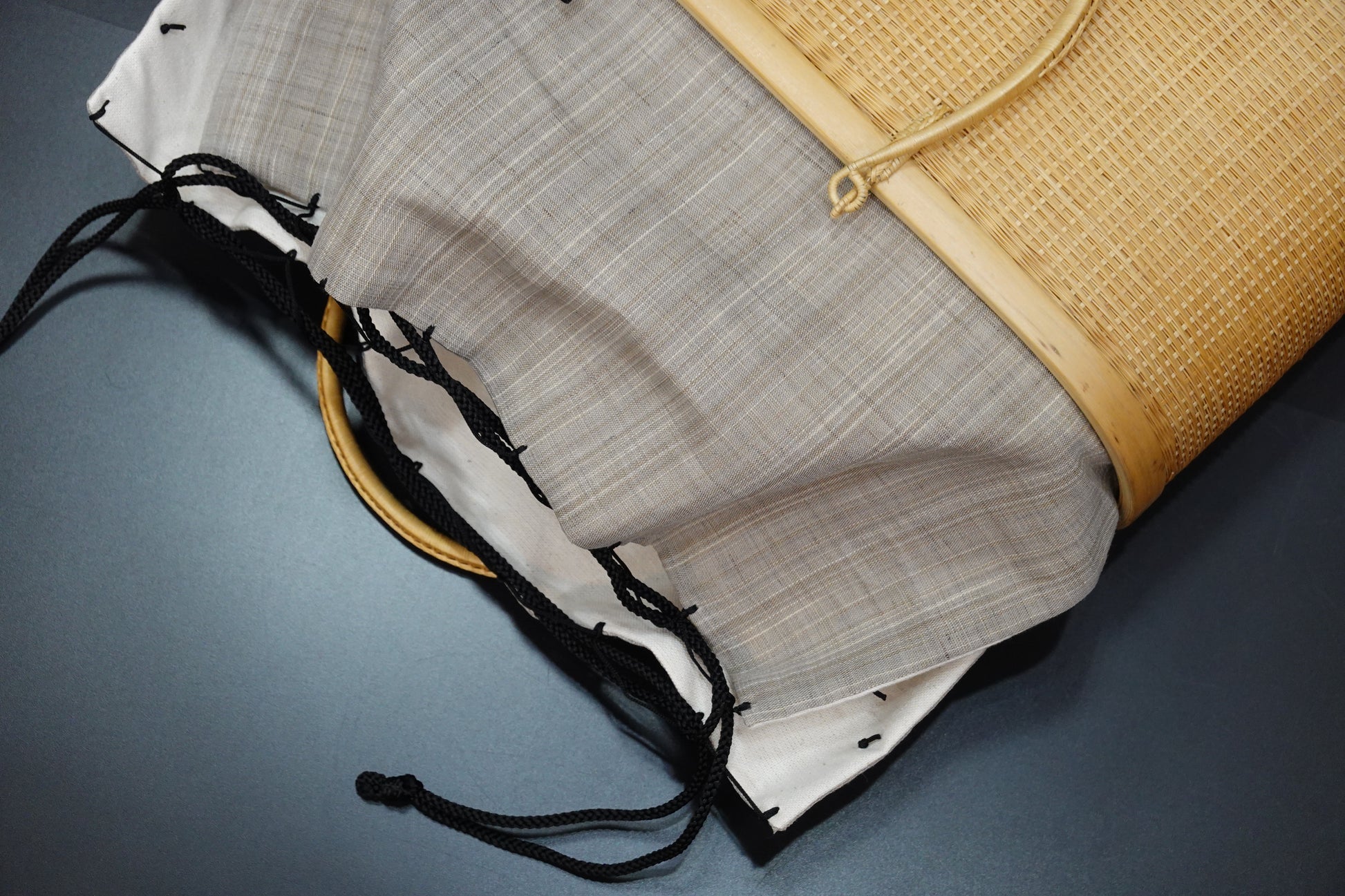 The dyed color of the hemp matches the elegance of the bamboo craftsmanship. The drawstring pouch is designed and sewn in Japan.