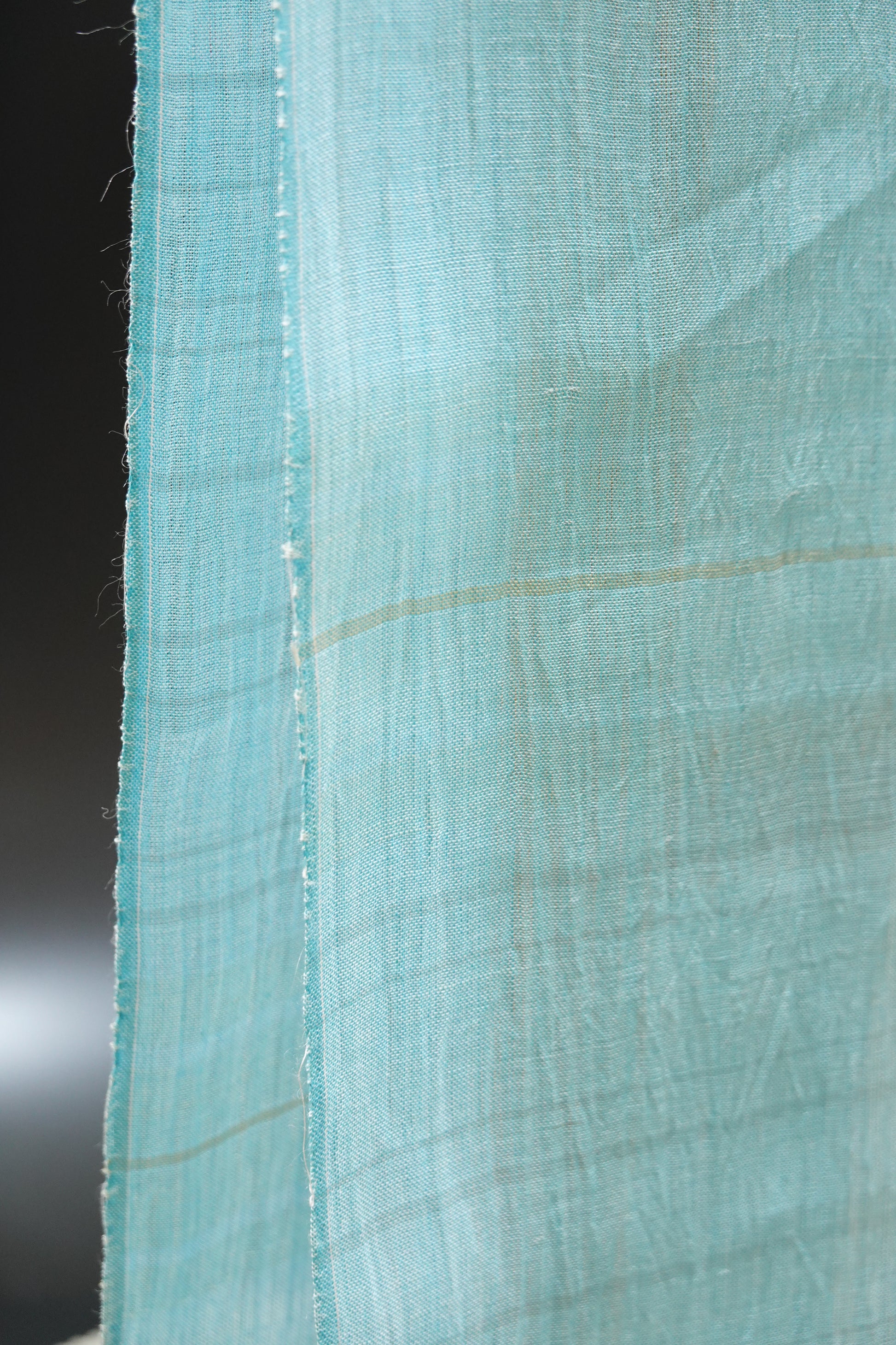 縞の多い小千谷縮ですが、こちら緯にも色糸が織り込まれています。現代的な色使いに”しぼ”感が相まって、その着姿は周囲にも涼しさを届ける特別なものに。水色を衿に持ってくるか否か等、お仕立て方を考えるのも、こういった反物の愉しみです。